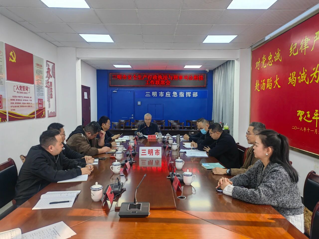 12月12日,三明市应急管理局牵头组织市公安局、检察院和中级人民法院召开行政执法与刑事司法衔接工作联席会议。与会人员观看了安全生产行刑衔接工作警示教育片,应急局通报了2025年三明市安全生产行刑衔接工作情况,讨论交流了行刑衔接工作的经验做法,受邀参加的三明市应急管理综合行政执法社会监督员提出了意见建议。